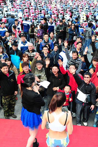 現場熱身活動在主持人以獎品略施甜頭之後,現場氣氛可說是達到了最高潮,所有的車主都擠在舞台前高舉雙手大喊「選我!選我!」。另外主辦單位也很貼心地準備了更大的獎品,讓車迷上台互相PK,只要能夠大聲喊出對Cuxi的熱愛,就能贏得YAMAHA原廠的精美好禮。