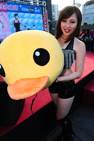 第二階段的PK由最近最火紅的熊貓圓仔和黃色小鴨上場,不過圓仔可能是忙著接客沒有洗澡,身上太髒不讓拍照,所以這次的黃色小鴨沒有給人漏氣,搶到了獨家的版面。這遊戲的難度在於帶上頭套之後呈現全盲狀態,需要以兩人一組引導方向,手持鼓棒先敲到鑼的就是贏家囉!