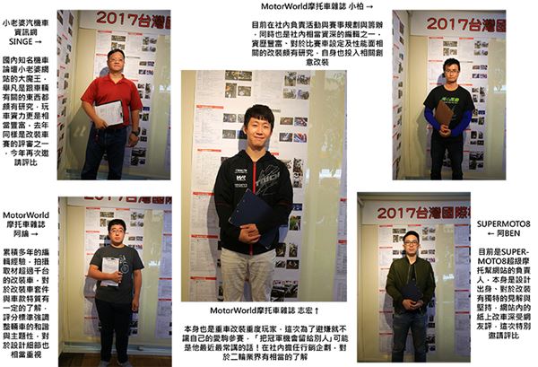 初選的部分我們也特別請來小老婆汽機車資訊網的大魔王辛格,以及SUPERMOTO8的阿BEN與社內同仁進行初選,共五位的評委、每個人根據參賽者付上的圖片、文字介紹來做評分,評分項目分別為:主題造型風格、工藝設計功力、配備部品創新性、整車實用功能性等四項來做評比,每項佔25﹪,最後再將5位的評比分數作加總,取前38名晉級第二階段,也就是能入場參展。