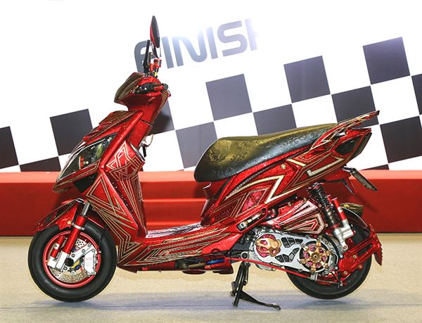 首先全車內外裝以紅色的惡魔金蔥打底,再用金色、銀色、兩種顏色的金蔥,及在台灣較為少見的銀箔以線條的方式來做不規則的呈現,車體部分則是全台第一組寬體空力套件,搭配自己的巧思鑲入碳纖維貼片。精品配色大多用紅、銀、黑、三色來做搭配,前後避震系統都選用Msp部品,前制動的卡鉗雖然看起來低調不起眼,但卻有瑞典改裝國寶之稱的ISR對四卡鉗,但在台灣算是相當稀有少見的,因為這款車原廠並無後碟系統,所以後制動為加工修上,剎車系統方面左右兩邊都採用Brcmbo 13mm的油杯款側推總泵,加上外漏的Rizoma油杯左右兩邊也刻意設計不對稱感,這些不僅讓行車時在剎車方面更敏捷也更安全,也讓視覺感更豐富,為了舒適度與美觀也特別客制化了很有質感的壓花坐墊,前後輪框、傳動蓋、後搖臂、飛旋踏板、內裝腳踏飾板、防倒球、全部都是選用鳳梨合作社相當有質感的改裝品,後框是客制化較為特別,仔細看會看到外框是用彩繪加上金箔,內框則是用CNC刻字,傳動蓋及後搖臂都是限量的鍍鉻版本,內裝腳踏飾板則是鍍鈦版本。再來就是一台車的重要靈魂,排氣管,前段及支架都是用鈦合金純手工燒製,尾段採用在重機上才會比較容易看到的Akrapovic碳纖維排氣管,俗稱蠍子管。最後,是後內土除,紅色的碳纖維加上銀箔彩繪出的羽毛及這台車的名字。羽毛則是述說,玩車就像在孵一顆蛋,不僅要小心翼翼的躲避許多天敵,付出的心血和心思越多,孵化出來的羽毛就會越完整越美麗動人。
