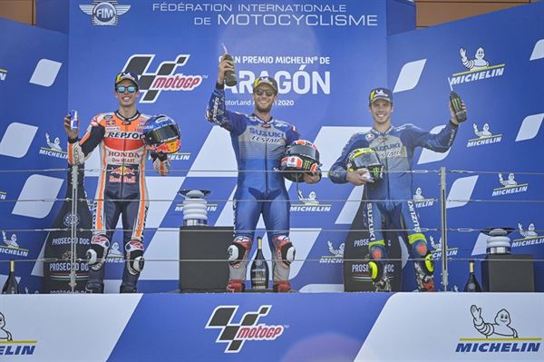 西班牙站頒獎台(左起):Alex Marquez、Rins、Mir
