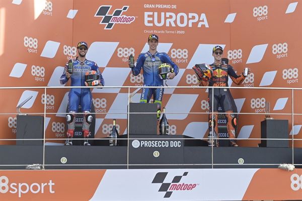 西班牙站頒獎台(左起):Rins、Mir、Pol Espargaro