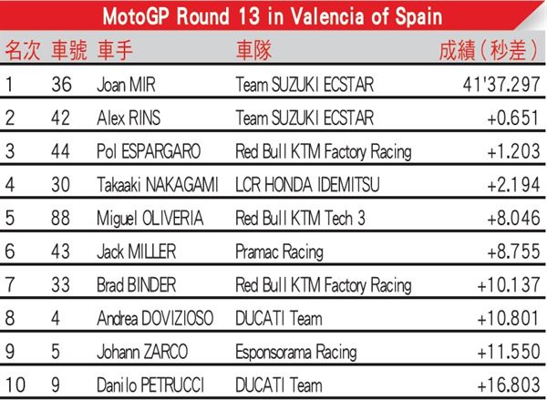 本回排位由Pol Espargaro拿下杆位出發位置,接著有Rins和Nakagami。第二排Zarco、Mir和Aleix Espargaro。第三排Miller、Oliveira和Morbidelli。27圈的正賽開跑後Pol Espargaro守住領先的位置,Rin和Mir緊追在後。而第二圈開始Rins看準機會對Pol Espargaro一個超車便來到領先的位置,而Mir原本還在第三,但沒幾圈後他已經追到Rins的後方。兩人近距離的對戰對Rins來說是一大挑戰,想甩掉Mir真的不容易啊!再說兩人也同是SUZUKI廠隊的隊友,誰拿勝都對SUZUKI是件好事,不過到了下半場比賽Mir順利的超掉隊友來到領先位置並死守到終點線。第三位置則是由Pol Espargaro給帶回。另外剛歸隊的Rossi則在第五圈時卻因戰車出問題而退賽。這一勝Mir來說就等看下回比賽是否有機會提前封王啦!