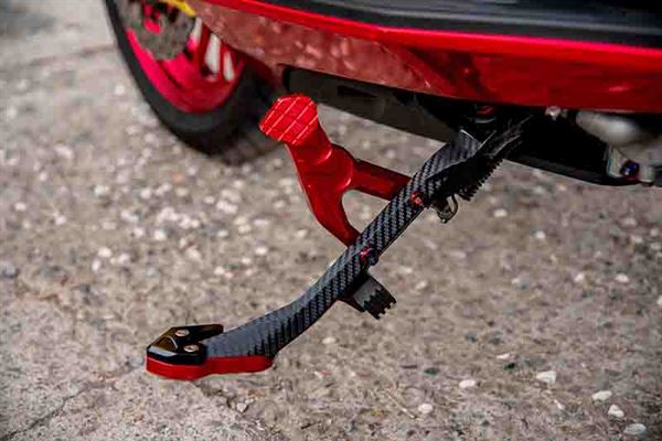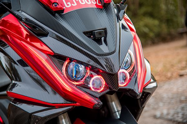 純手工改裝4魚眼頭燈、全車美國3M亮面卡夢/日本3M卡夢/美國艾利電鍍紅包膜、RIDEA機油尺/側踏、前/後Brembo手工特殊塗裝、全車POSH鈦合金螺絲/墊片、GOWROKS短牌架/短卡夢後視鏡、前後輪軸防倒球、鋁合金後皮帶輪裝飾盤、MOS鍛造輪框
