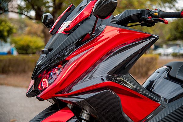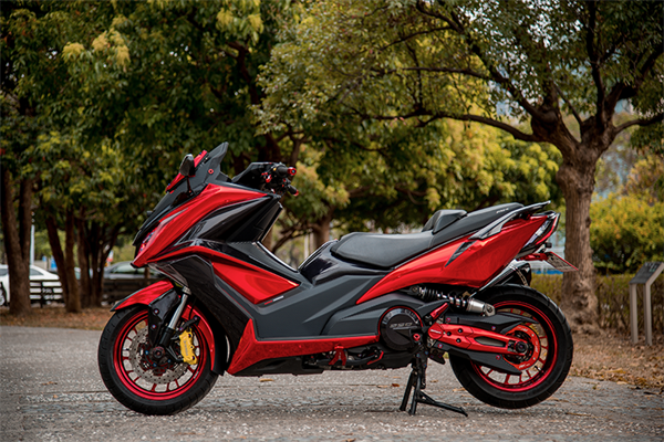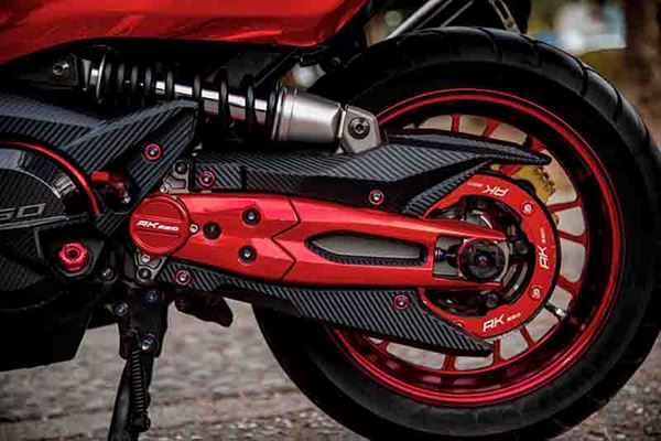 AK550是台灣自製可與YAMAHA T-MAX匹敵的運動速克達,但是改裝風氣並還沒像T-MAX風行,所以這一台車主自製四眼魚眼大燈以及其他改裝的AK550才更顯珍貴稀有。車輛以高對比紅黑視覺為主,讓AK550披上美國艾利電鍍紅包膜和3M亮面/消光卡夢貼膜達成如此張狂的第一印象,車主自製的純手工改裝4魚眼頭燈並搭配四LED燈圈使AK550車頭視覺更炯炯有神,使其如一隻路上的鯊魚野獸般栩栩如生,車輛細節零件以鋁合金陽極紅製成零件來點綴,與車色主題性相互呼應,而在最細部以POSH鈦合金螺絲增添質感。