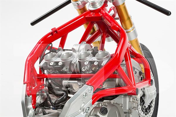 (車身骨架採用鋼管編織工法穩固包圍著引擎上半部,下半部採用鋁合金板與其結合為BIMOTA近幾年來的風潮)