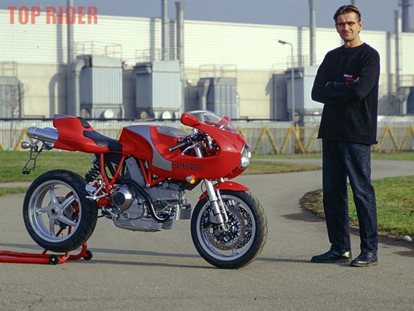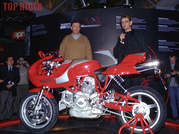1998年的慕尼黑科隆車展上MH900e掀起了巨大的討論熱潮,促使DUCATI在隔年波隆那車展上端出市售版本,上圖為市售版發表照片,手持麥克風的人即為設計師Pierre Terblanche