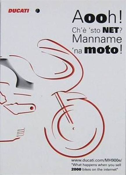 限量2000台的MH900e是史上第一台純網路接單的摩托車,專用的銷售網站於2000年1月1號接單,頭一千台在31分鐘之內就售完了,剩下的在12個小時內也跟著售罄。左圖為DUCATI事後出版、記錄當時網路回響的《網路上在搞什麼,趕快給我摩托車》一書封面。