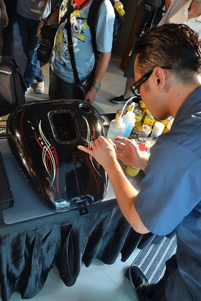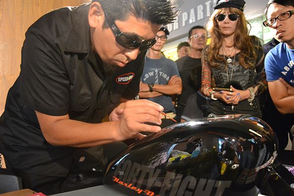 另外在台北的展示中心,也特別邀請小林誠、福田聖隆與後藤稔等人再進行連續二日(7/20、7/21)的拉線表演,並與哈雷騎士們互動。特別一提的,在當天於店內消費特定商品,即可請屬意的大師為商品親筆彩繪點綴,便能立即擁有大師的神筆。