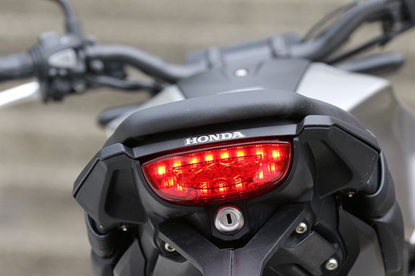 這台CB300R的油箱罩外型變十足飽滿,寬厚的造型及線條的轉折除了讓騎士雙腿擁有更良好的挾持性之外,當天所商借的銀色車殼烤漆在光線的照耀下更顯光芒,擁有著類工業風格的金屬粗獷美感,也與此次產品概念相互呼應。與其餘家族成員大同小異的車尾雖無如CB150R般搶眼的鏤空外型,卻在車身尾殼之中透過線條的變化,形成了一個隱形的後扶手位置,握感極佳,算是HONDA在吸引眼球之餘所增添的一點小貼心。