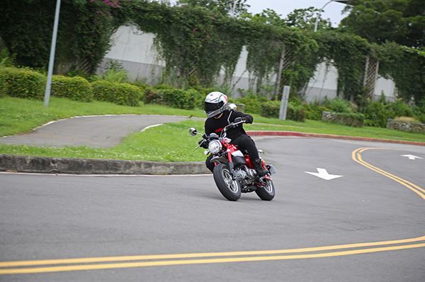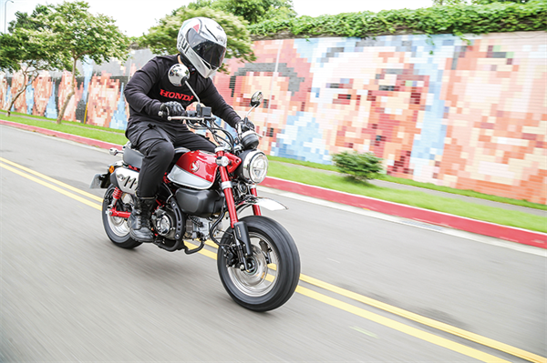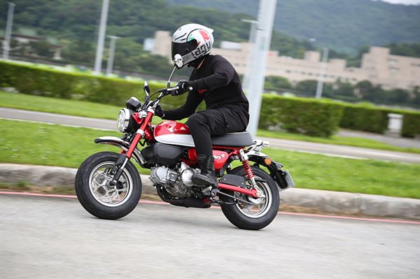轉開鑰匙發動上路,很快就能感受到那看似不成比例、實際乘坐起來卻又相當自在舒適的騎姿設定。別看Monkey 125小小一台,便以為他乘坐起來肯定相當侷促;反之,透過向上延伸的把手、肥厚柔軟的坐墊以及得宜的腳踏位置,騎乘起來就像正常尺寸的街車一般舒適自在。而同樣與MSX共用的引擎本體同樣採用新世代PGM-Fi電子燃油噴射供油,卻調校成了強調低速扭力輸出的特性,使得Monkey 125擁有相當輕快的加速表現,同時拉動離合器的手感就算沒有加諸任何省力裝置也同樣輕盈,騎士幾乎只須了解國際檔的作動邏輯便可輕鬆上手,享受迎風前行的樂趣可說是唾手可得。當行經顛簸路面時,Monkey的懸吊作動幾乎可以與它圓潤的外觀相比擬。雖然偏向舒適取向,Monkey 125的懸吊依舊保有相當程度的支撐性及過彎穩定性;當刻意行經較大的坑洞時,31mm倒立式前叉與雙槍後避震的伸張/壓縮速度的配合依舊能將車身的回彈控制在一次之內,並迅速恢復車身動態的穩定性。而往復式四檔儘管一、二檔之間齒比落差稍大,退檔較需確實補油之外,一般騎乘只需用到三檔便足敷日常騎乘所需,並未有力不從心的感覺也更適合日常騎乘。