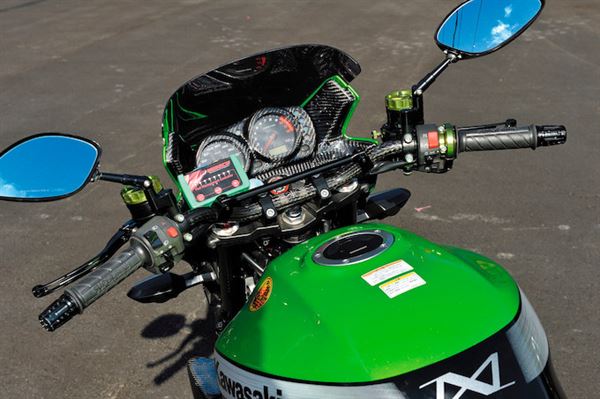 儀表板左邊的綠色長方形物體是控制點火時期的裝備,採用碳纖維儀表護蓋、PMC的龍頭握把,輻射對臥的前輪卡鉗等許多高性能的裝備