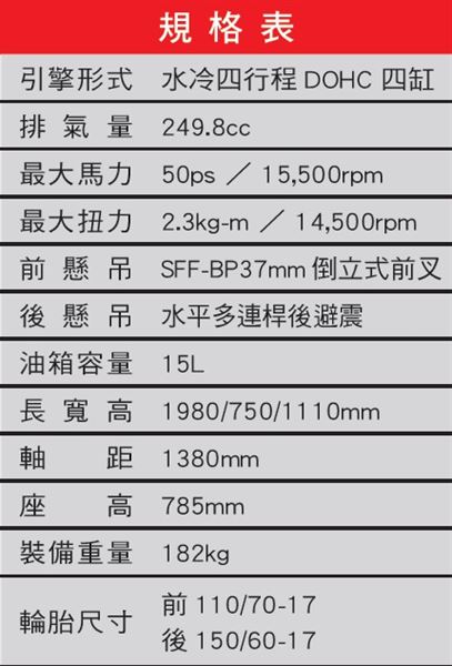睽違已久的250cc級距的並列四缸引擎再次出現,小排量的四缸聲浪更高亢美妙