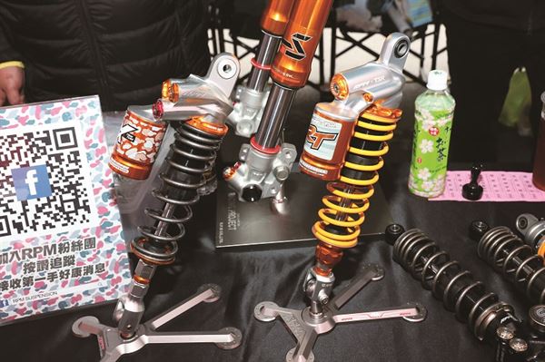 RPM 攤位上擺放的有Gogoro 專用的複筒式後避震器,以及性能優越的EX 複筒式後避震器。除此之外還有GII LS 氣瓶倒立式前叉以及轉體式防甩頭等性能部品,強化愛車操控性能之部品一應俱全。