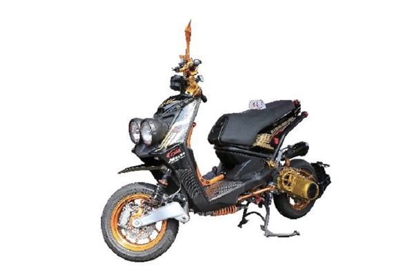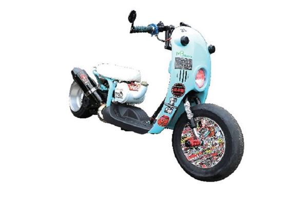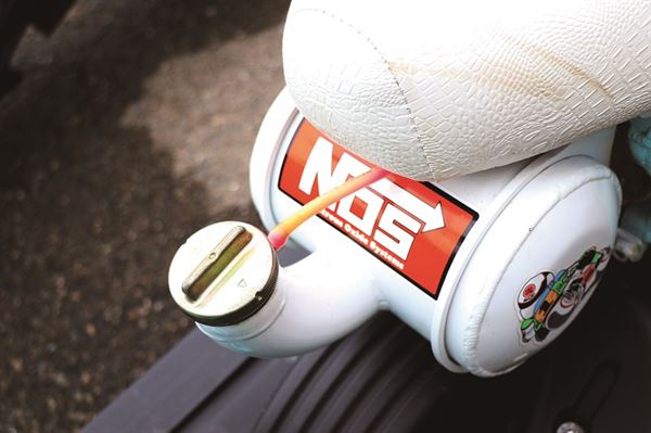 這部曾經紅極一時的”蛋蛋車”SUZUKI Choi Nori 50 雖並未擁有強勁動力,卻以它獨特的圓潤造型吸引了一票愛好者,更曾一度成為市場上的熱門改裝基礎。今日所看到的這部Choi Nori 以相當具街頭風格的方向打造,Tiffany 色的車身搭配了潔白可口的白色皮革壓紋作墊;此外該車卻令人意外地搭配上下斜把手、大幅度後移與加大節流閥配合香菇頭空濾以便奔馳時地大口吸氣。而寬厚地後光頭胎、高翹的排氣尾段與坐墊前貼著NOS 字樣的油箱也增添性能氣息;同時車身也搭配了街頭風格的爆炸貼紙,成為一部內外兼具之作。