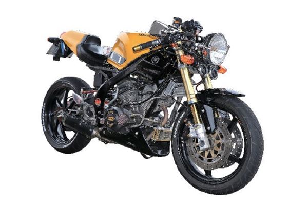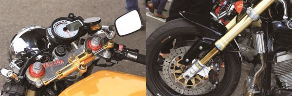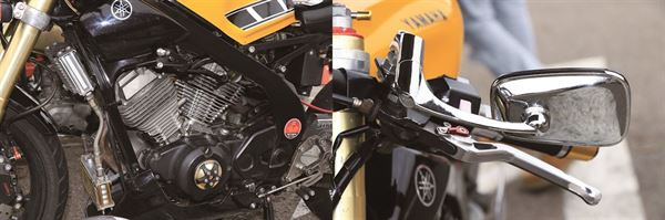 這台在今日也是相當經典的車款FZ2 在車主的巧思之下以充滿強烈跑格的扮相衝擊凡塵,重新設計、兼具流線與肌肉感的油箱與車尾造型一甩原先的方正面容,搭配上下斜分離把與後移角踏,使其擁有跑車般的戰鬥騎姿。前端在原廠雙碟的優良基礎之下裝上了Ohlins 出品的倒立式前叉,搭配浮動碟與NISSIN 對四卡前的同時後輪也移植了NSR 的單搖臂,覆蓋上60 周年黃色速度鏈塊塗裝後擁有超高完整度,也讓這部本就相當稀有的經典車款更顯彌足珍貴。