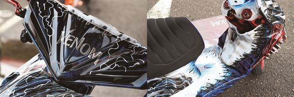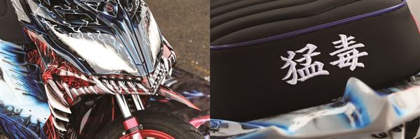 這部視覺系的三陽 JET S 雖然僅針對懸吊與制動系統作基本的升級,不過以漫威英雄「猛毒」為主題的它,以色調非常鮮明藍、白、紅三色彩繪妝點整部車輛,在前輪周圍的部分則成為這部猛毒號的血盆大口,配合JET車系常用的鯊魚鰭、進氣口等改裝素材讓整部車更具立體氣勢。同時彩繪的用心程度連內裝踏板、引擎胸蓋甚至空濾、傳動蓋都不放過。此外除了相當一置地採用紅色精品為整體性增色之外,在車頭及坐墊也有猛毒的精緻中英文採會與刺繡,外觀細節的處理相當細膩。