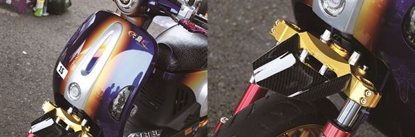 乍看之下,這部PGO旗下相當受歡迎的時尚小車JBUBU看似僅僅裝上市售改裝套件,卻總覺得哪裡不對勁,踞地姿莫名多了許多霸氣;定睛一看之後才發現代誌大條,車上裝的可是NCY 出品的CNC 三角台、搭配上一對GJMS 出品的33mm 前叉與前後12 吋胎框,儼然是直接從12 吋運動車款所移植而來,在低扁平比的配胎下更顯性能風格。在前雙碟、brembo 15RCS 直推總泵與開孔的引擎胸蓋等的交互搭配下,也讓人相當期待這台車的動態表現!