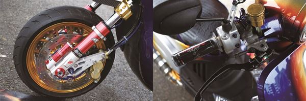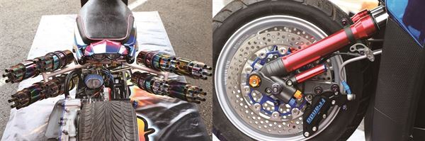 從這部BW’S 之中,相信不難體會所謂「極致純粹的SHOW BIKE」為何物。其原因可以是因為那超寬的後胎、也可以是那低到早已觸地的車高與誇張的後移,兩旁八隻造型相當誇張、向左右大幅度延展的機槍造型排氣管更是令在場觀眾看得目瞪口呆。此外,前雙碟搭配對四卡鉗的設定、特殊擺放位置的後避震與一字排開的監控儀表也造就了直線加速車般的霸氣。