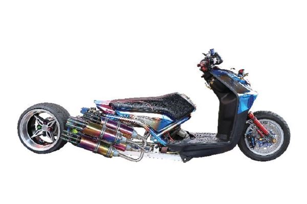 擁有把妹神車美譽的YAMAHA BW’S 雖然已經歷經了數次改款,在改裝市場當中依舊是展現改裝想法非常有潛力的基礎平台車款之一。眼下這台BW’S X 可說採取了相當激進的改裝方式:在類似跑車設計的分離把下,掌控的是一具前搖臂的懸吊系統,後輪同時改為單搖臂設定的同時也大幅改變引擎放置角度與懸吊設定,以貫穿車底的多連桿後避震造就高翹的車尾,其下高調的進氣香菇頭與大口徑節流閥跟鐘出設計的排氣尾段同樣高調逼人。