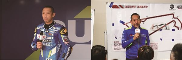 在課程的一開始, 除了使用第一節在麗寶G2的「風」賽道熟悉路線及環境之外,也讓青木選手能夠了解學員原始的騎乘風格。在每節騎乘下場之後,便是青木宣篤的教學時間。青木選手首先在磨膝技巧的使用上做出了提醒,接著就以學員為示範,調整學員的騎姿並強調以膝蓋固定身體的重要性與訣竅、並且在最後傳授在入彎時帶一些前煞車以增加前輪抓地性的技巧。而儘管需仰賴翻譯慢慢講解,青木選手依舊耐心地為每位學員指出騎乘上需要改進之處。在當天的教學結束之時,不僅每位學員都能獲得青木宣篤親自簽名的結業證書並合影留念外,青木選手最後也換上了KATANA以及GSX-R1000R上場進行表演圈環節,在大直線上的頻頻孤輪與令人驚嘆的入彎速度與聲浪,成為當天在場所有人最難忘的回憶。