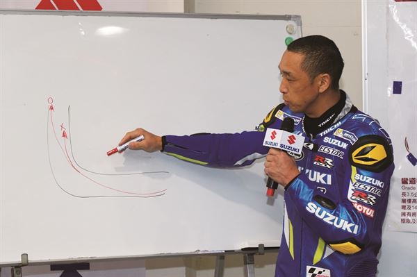 一般人由直線入彎通常會在直線完成減速,然後放開煞車進入彎道。青木選手則建議大家提早減速進行入彎配速,然後帶著消除間隙後再施壓輕微的煞車入彎,直到APEX點為止。如此一來前叉便能維持在一定程度的收縮狀態,前輪的抓地性能便會維持一定的水準。