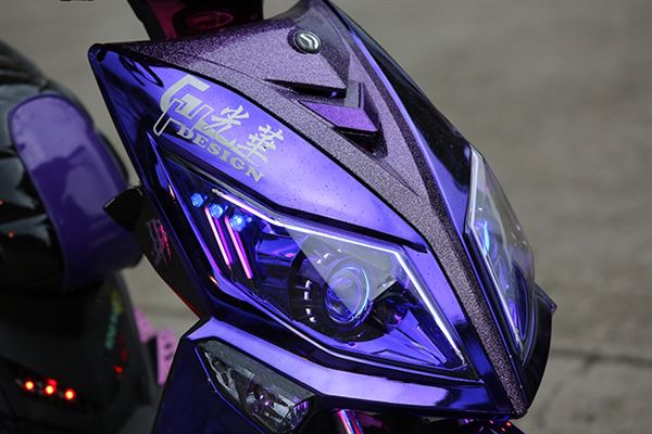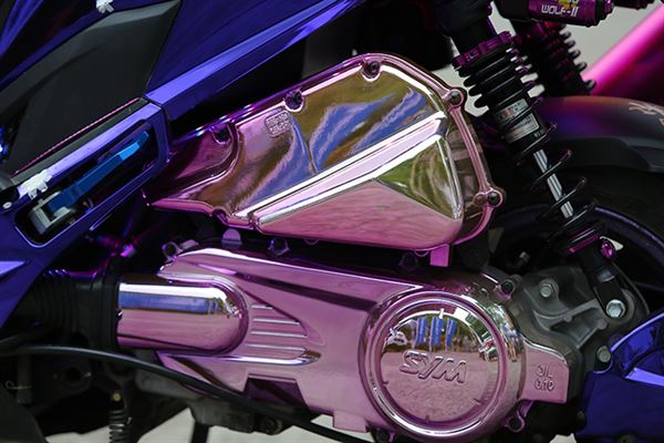 電鍍到底有多難保養已經是眾所皆知的事,但仍然有狂熱玩家選擇電鍍來裝扮自己的愛車。好比這輛三陽JET‧POWER125,全車鍍上紫色電鍍,搭載的所有改裝精品也選擇紫色來保持車輛的一體性。金蔥烤漆在這輛車上也算擁有不少戲份,風扇蓋、後排骨以及輪框都採用金蔥處理,不僅讓整輛車的配色更完整之外,還增添了許多神秘感。重新包過的椅墊,同樣也選擇紫色亮皮,菱形的紋路更是一大特點。不得不說車輛的細節部分處理的相當完美,可以感受得到車主愛車的程度。改裝的排氣管有著粗大口徑,排氣聲浪也特別雄厚,讓它在高速行駛時仿彿一顆威力無比的流星。