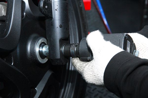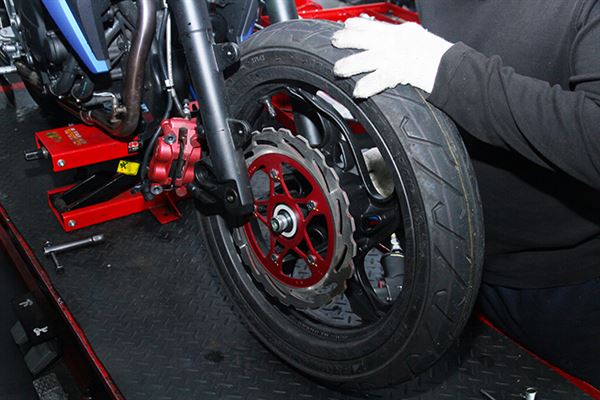 用下方的前輪軸心來測定兩側前叉的對稱。