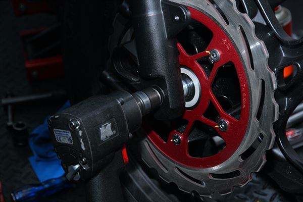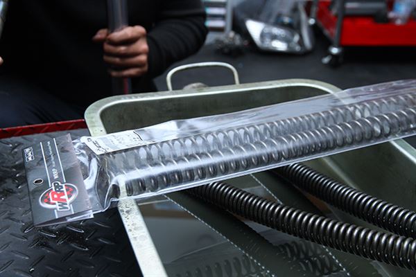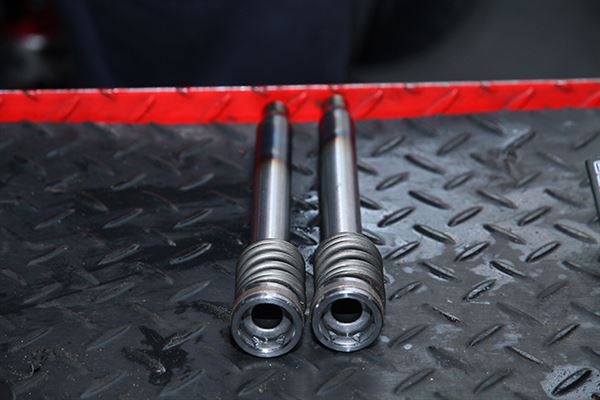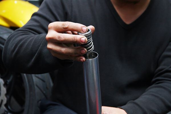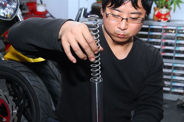 而SYM T2 250原廠的重量就達173KG,如果再加上騎士的重量,就接近240KG,雙載更可達300KG,在騎乘、過彎、煞車時,前叉的持久性、支撐性與穩定性相對地十分重要,因此不僅得更換不等距彈簧,也得修改阻尼棒以及阻尼油。不等距彈簧與等距彈簧的差別在於,等距彈簧下壓的力量都是呈正比的,而不等距是下壓到一定程度後,得用加倍的力道,才能達到一樣程度的下壓量。通常高性能前叉都會採用不等距彈簧,加強車身的支撐性以及下方吸收衝擊的能力。