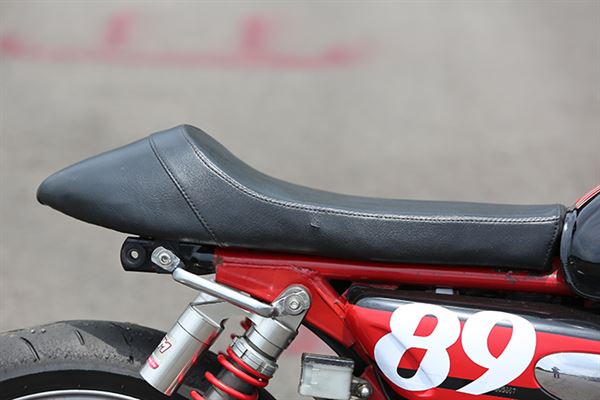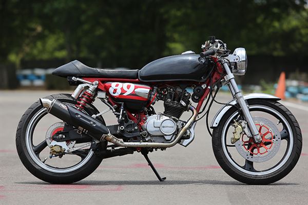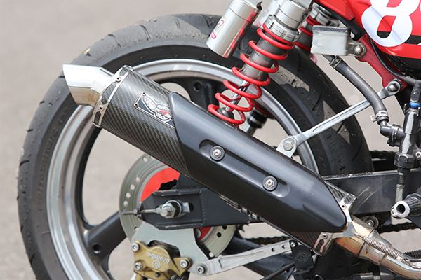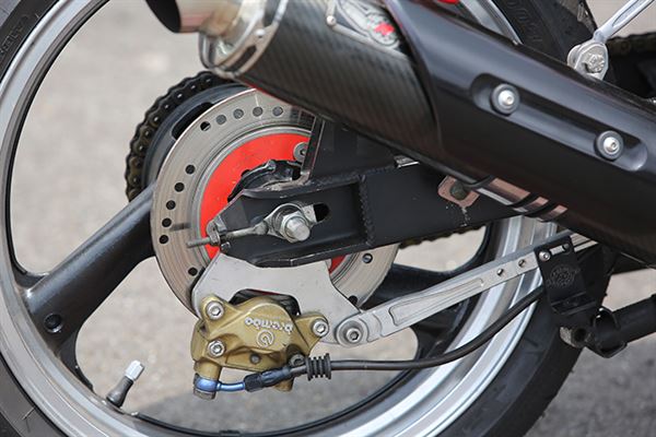 不仔細看的話,絕對不會知道這輛WOLF125是台在賽場奔馳的競技車。長版的前土除、單座椅墊加上油箱,以及那側蓋上的線條烤漆,一整個充滿了「Café Racer」風格!但是簡潔的外表下還是有不少的高級品。眾所皆知,擁有良好的制動不論是對道路車或者是競技車來說都是不可或缺的。後碟系統加上下移的BREMBO卡鉗讓煞車時可以有更好的操控性,而加大的前碟盤搭配BREMBO卡鉗,讓制動性能大大提升。最後改上了武田碳纖維RR管讓引擎出力得到更好的釋放,腳踏後移也是讓騎士三角完整的一大功臣!