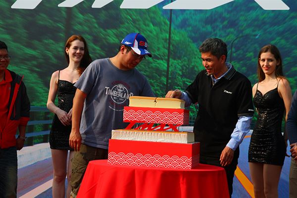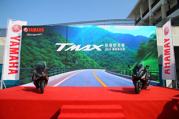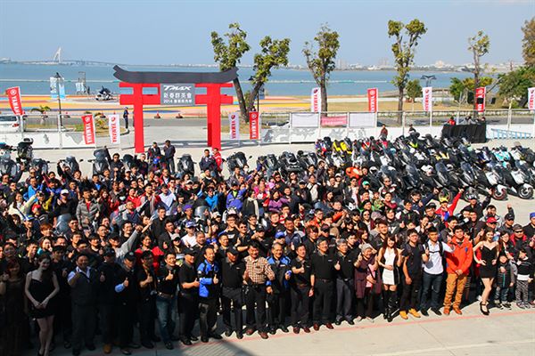 上百名TMAX車主當日集合於代表活動精神的鳥居下合影,為活動揭開序幕,緊接著兩名外籍模特兒出場,以優美的姿態與舞台上的TMAX新色及特仕版互動,詮釋出TMAX豪華、舒適的魅力,成為現場車友搶拍的攝影素材。