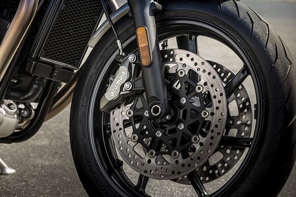 1430mm的加長版軸距配上41mm不可調的KYB前叉,使車子前後以50/50%做出完美的平衡點,這點比起Thruxton的前輕後重48/50%來的好許多。如果有人對於不可調和非倒立式前叉有失落感,不如再等個幾年吧!相信後續TRIUMPH會推出R版來強化這些配備的。目前這規格似乎是對應對手BMW的RnineT Pure版本,並非高階版。
