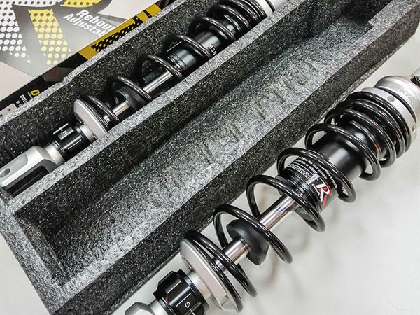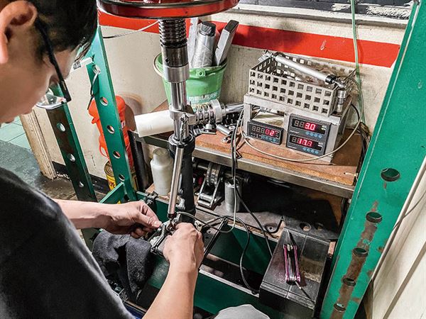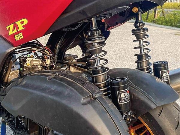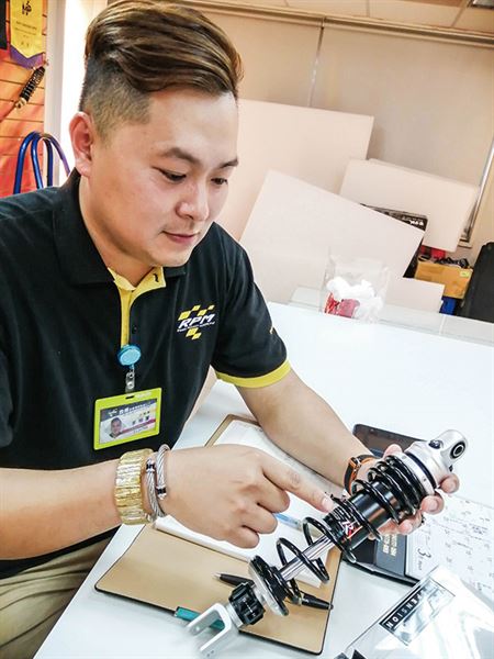 開發過程中發現彈簧BL值設定太軟也不行,太硬也不行真的非常的麻煩,在引擎吊架上先加裝襯套是一招,最後決定搭配疏密型彈簧,利用初期的軟再轉硬的線性變化,搭配在六代勁戰上,李經理表示因為六代戰的後避震,設計比較直的問題,末段最深的位置受力突然會增加,開發初期時常遇到「軟腳」的情況,經過不斷改善,目前市售的品質與水準已經相當好,對應一般消費者或賽車選手使用都沒問題。