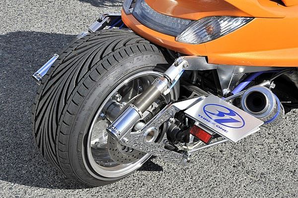換上汽車用的輪框和輪胎,值得注意的是避震器和搖臂的連結方式,相當具有設計感