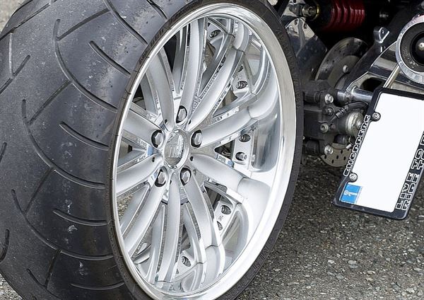 一看就知道使用的是汽車輪框,極大的寬胎令人目不轉睛