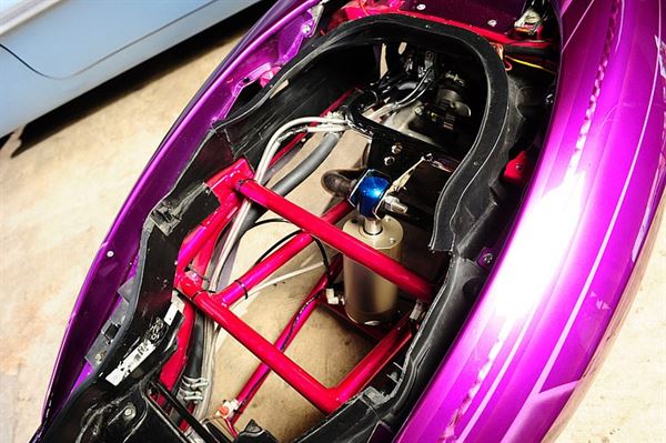考量到需要雙載行駛的關係,刻意在坐墊下方做補強車身的結構,並巧妙地埋進多連桿避震器