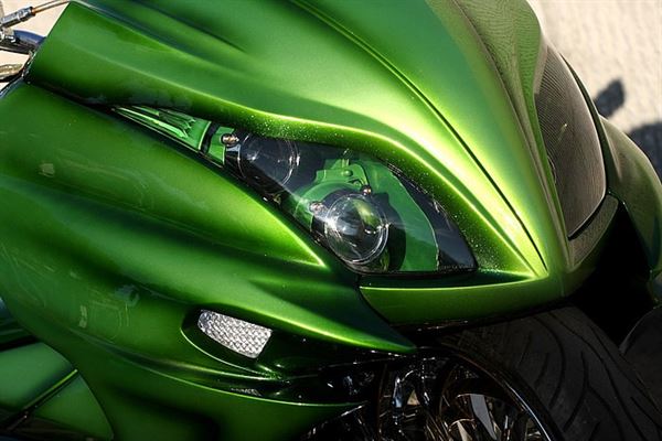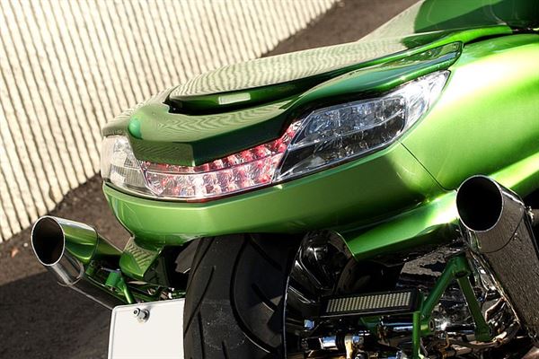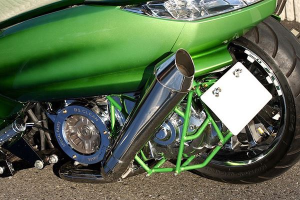 左右雙出式的排氣管,並且利用綠色的鋼管編織保護架來保護傳動處