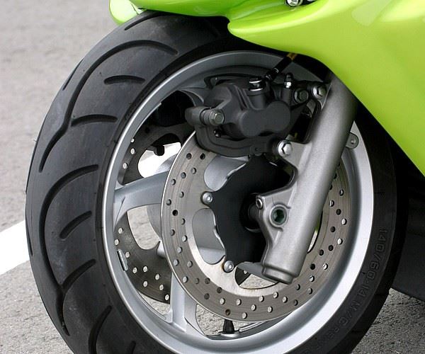 前輪的尺寸從原廠的12吋擴大了兩吋,而且竟然換成雙碟煞的高規格產品