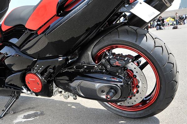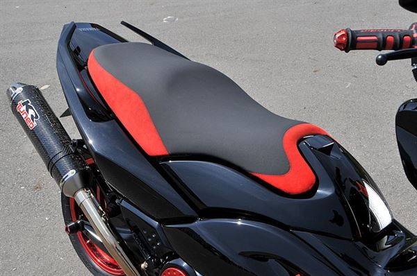 雖然外觀還是速克達,但基本骨骼已經完全跑車化了,燈系全部翻新,利用紅色的小零件來點綴黑色的車身