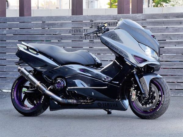 車身採用了金屬灰的顏色,讓TMAX的肌肉感更加凝鍊,除了散發著成熟風格的顏色之外,在現代已經算是特殊設計的雙眼頭燈也帶來與眾不同的氣息,加上許多碳纖維的配件,打造出俐落的運動感