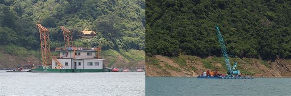 水庫中常間的成排浮筒其實底下是大片的攔沙網,